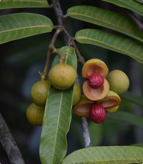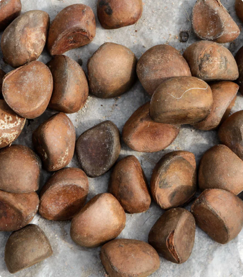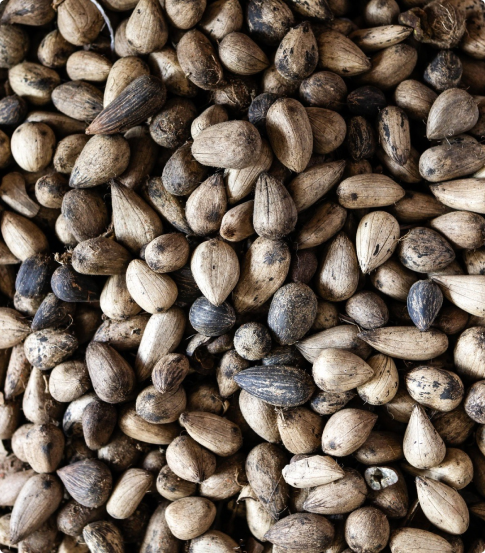 Processo sustentável de coleta de sementes de uma árvore de aproximadamente 30 metros de altura, da família da Carapa guianensis.