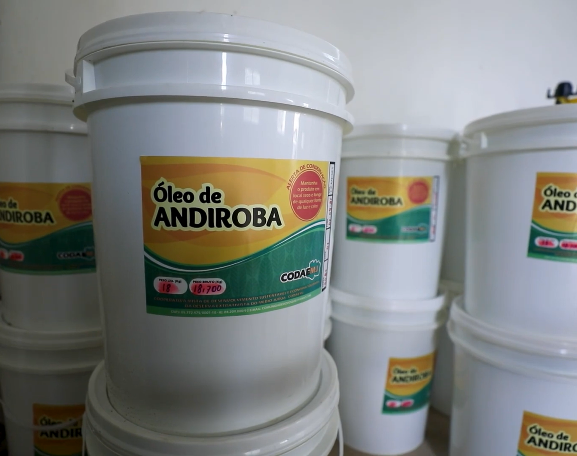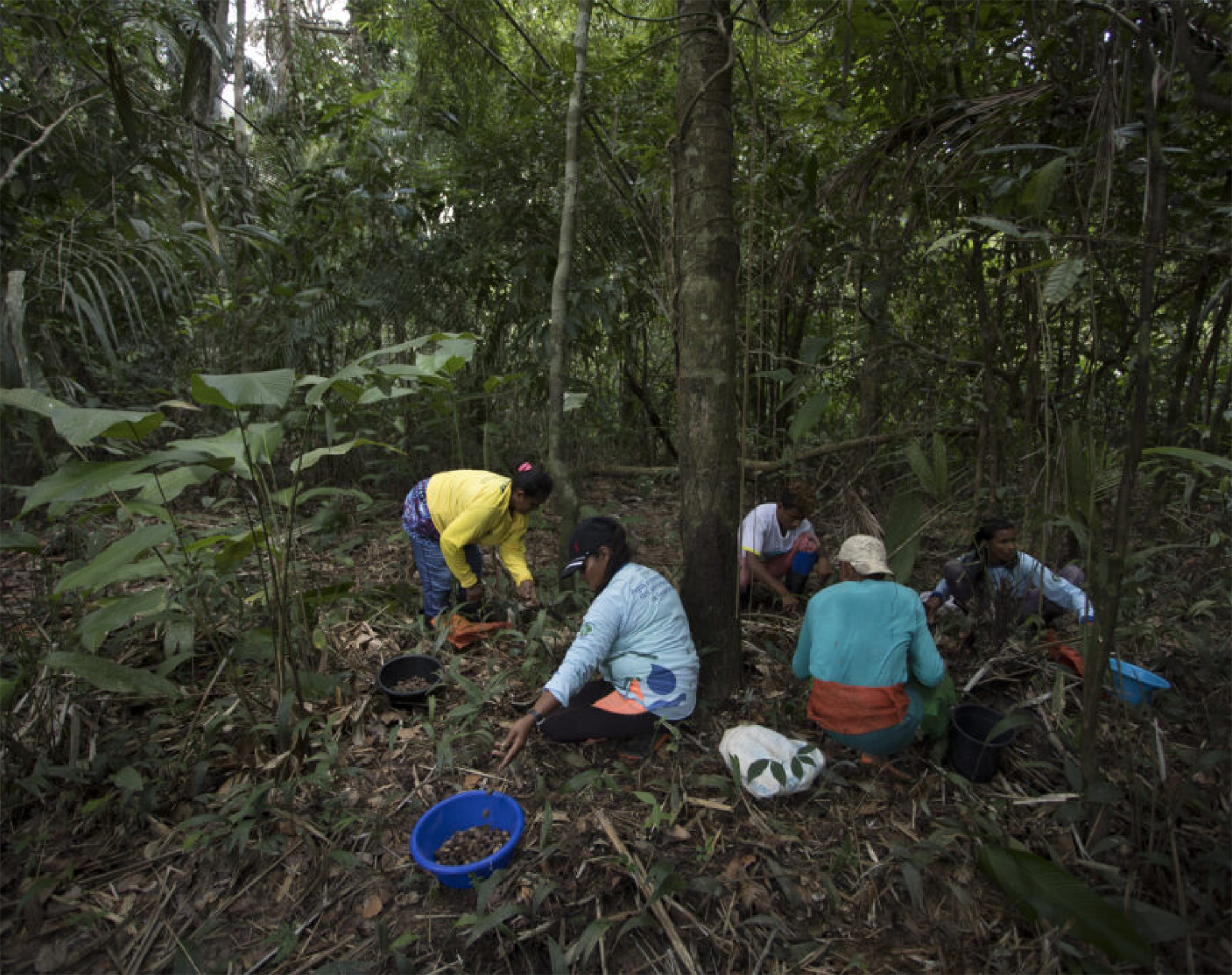 Homens e mulheres vão até a floresta para coletar sementes de Andiroba, Ucuuba e Murumuru.